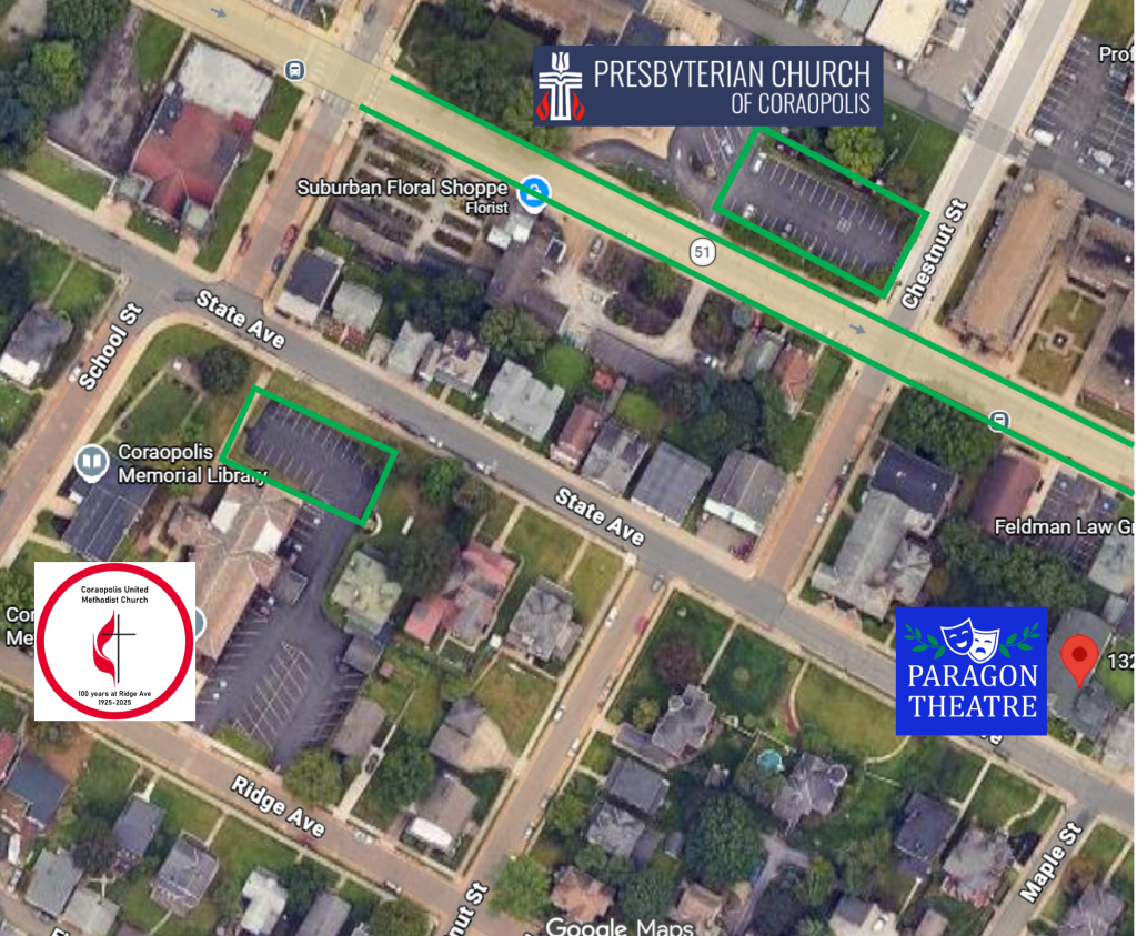 Parking in any other area is not approved by Paragon Theatre and may be subject to consequences. Please respect our immediate neighbors and the Coraopolis community by parking only as outlined and shown above. Thank you!!